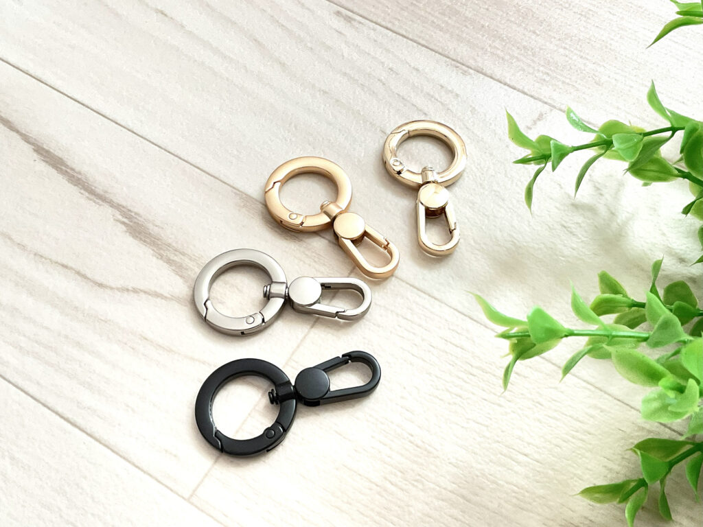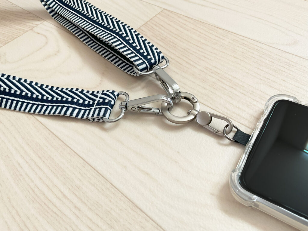 一般的なスマホショルダーの金具は細い紐専用のものが多いですが、このカラビナは内径が広めの「丸型リング」を採用しています。