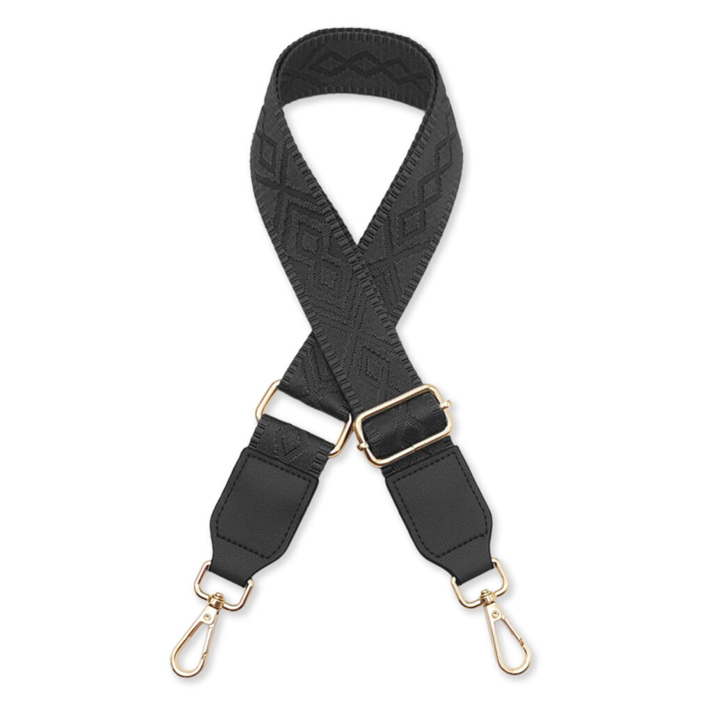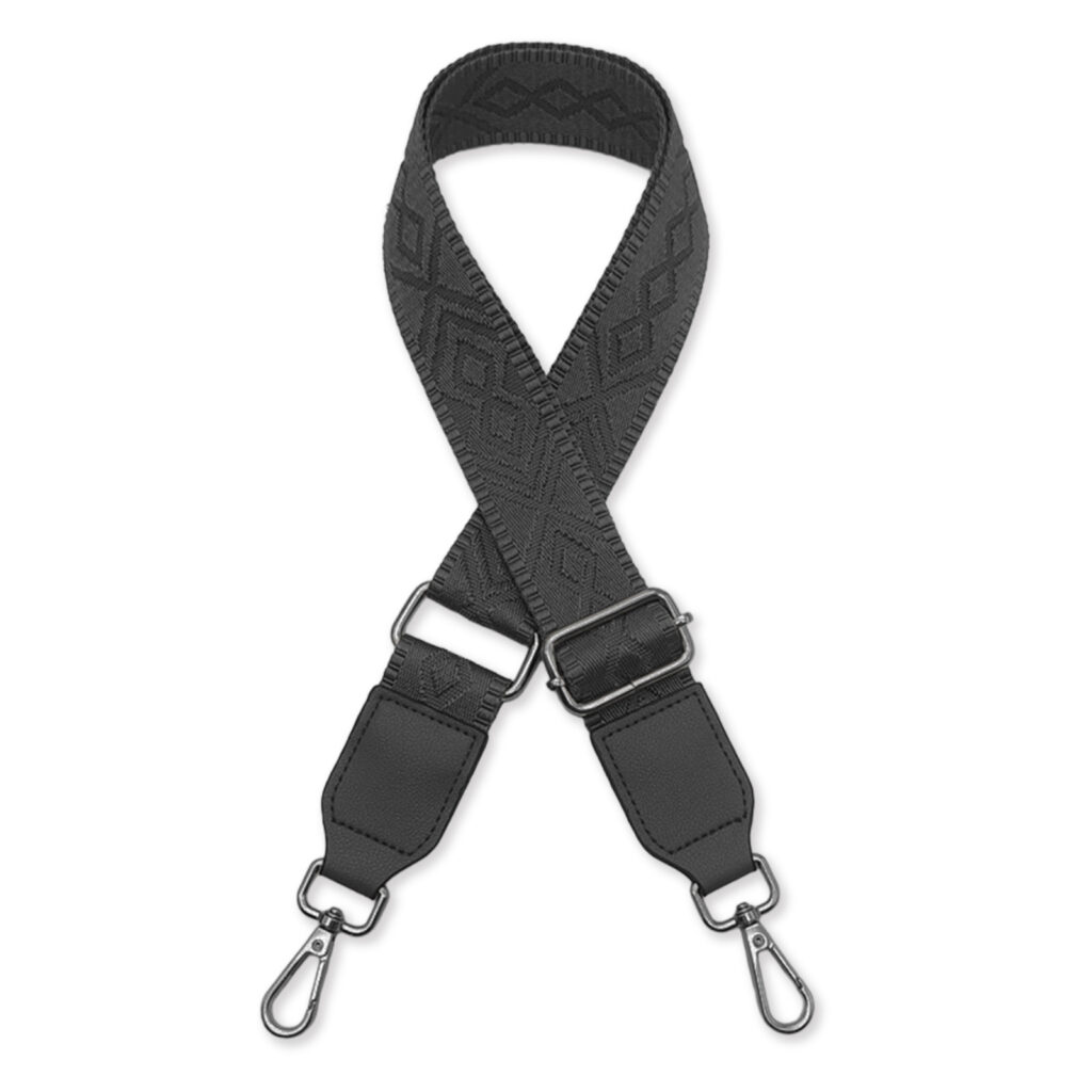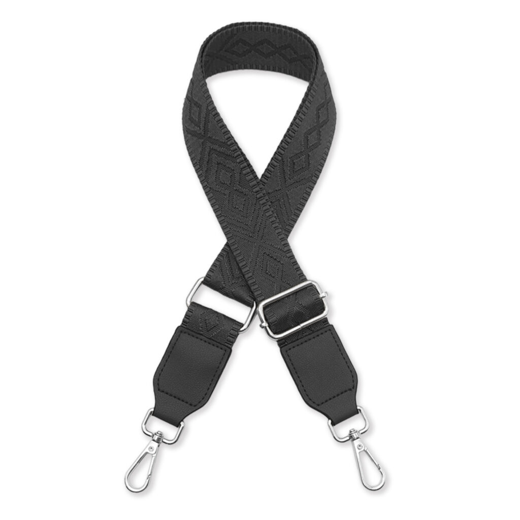 幾何学模様がおしゃれ。太めショルダーストラップへの付け替えで、肩への負担軽減と手軽なバッグの模様替え